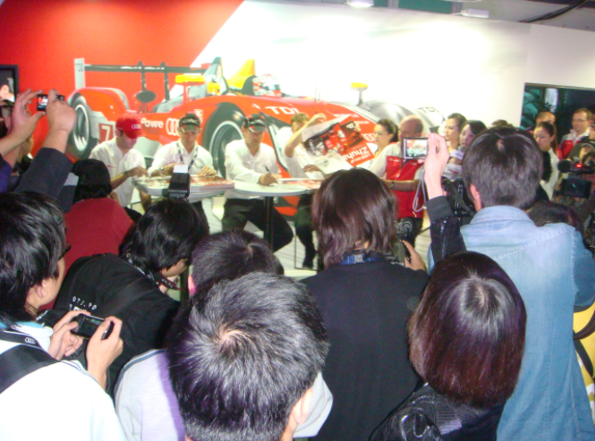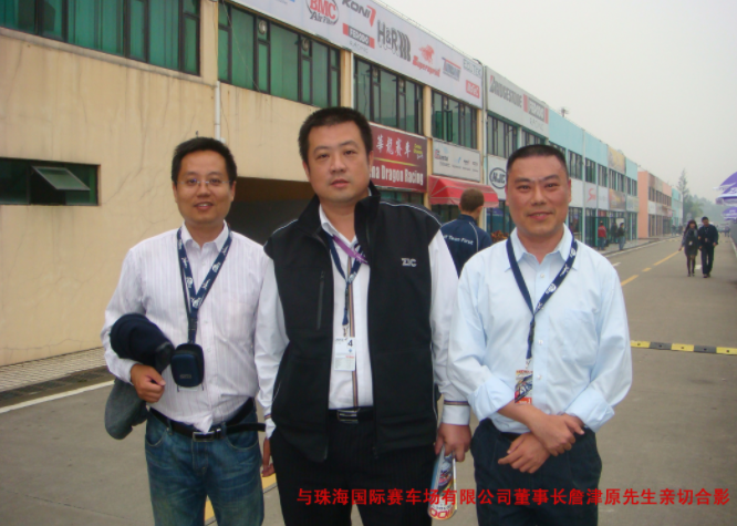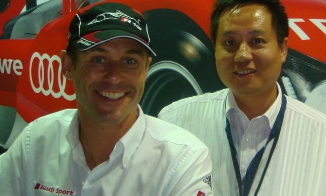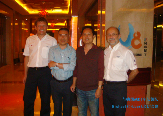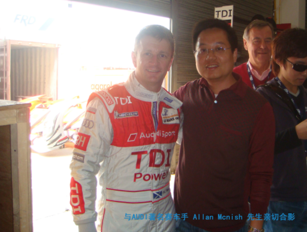 图为陈具总经理与瑞士劳力士(ROLEX)豪华腕表-蚝式恒动宇宙计型迪通拿之广告代言人、德国奥迪(AUDI)摩洛哥籍车手汤姆·克里斯滕森先生(Mr.Tom Kristensen)亲切合影,他曾八次荣获勒芒(Le Mans)24小时耐力赛冠军、五次勇夺赛白灵(Sebring)12小时耐力赛第一。